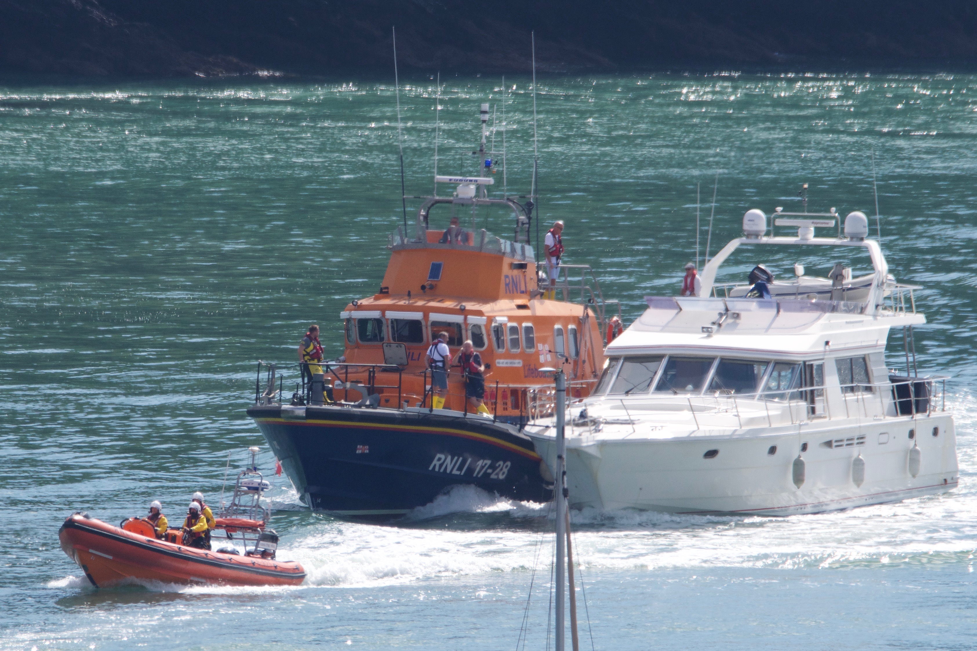 Dart RNLI Launch 477 + Torbay AWB. Dart RNLI Atlantic class boat attended a distress call from motor vessel Kristina which was reported to have a fire on board. Joined by The stricken craft was towed into Dartmouth. Photo: Andy Kyle – Non-RNLI individual