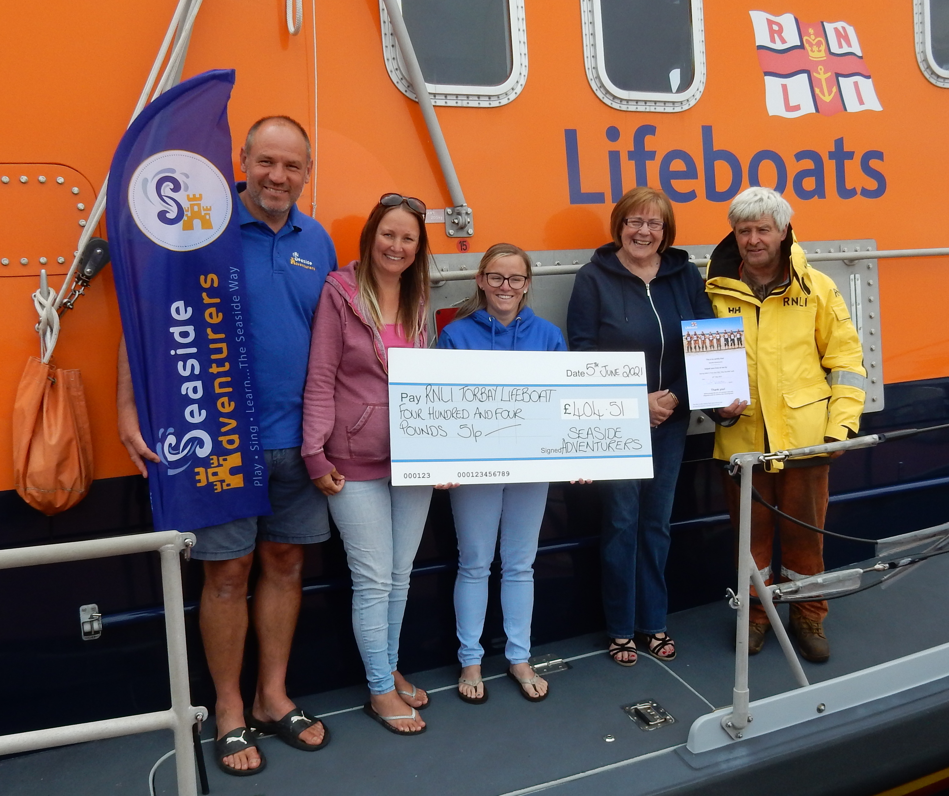 A cheque was presented to RNLI Torbay for £404.51 from Seaside Adventurers raised by doing the Mayday Mile on 14 May.